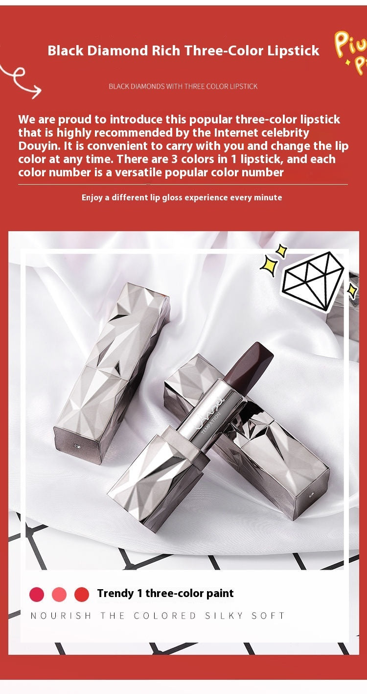This innovative lipstick features a tri-color design, offering a blend of shades that create a unique and captivating lip look.